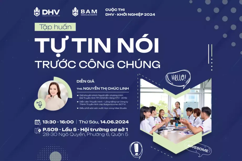 Nằm trong chuỗi hoạt động của Cuộc thi DHV – Khởi nghiệp 2024, BTC cuộc thi tiếp tục đầu tư tổ chức buổi tập huấn, nâng cao kỹ năng mềm cho các bạn sinh viên với nội dung “Tự tin nói trước công chúng”. NỘI DUNG: Các yếu tố cần thiết để thuyết trình tự […]